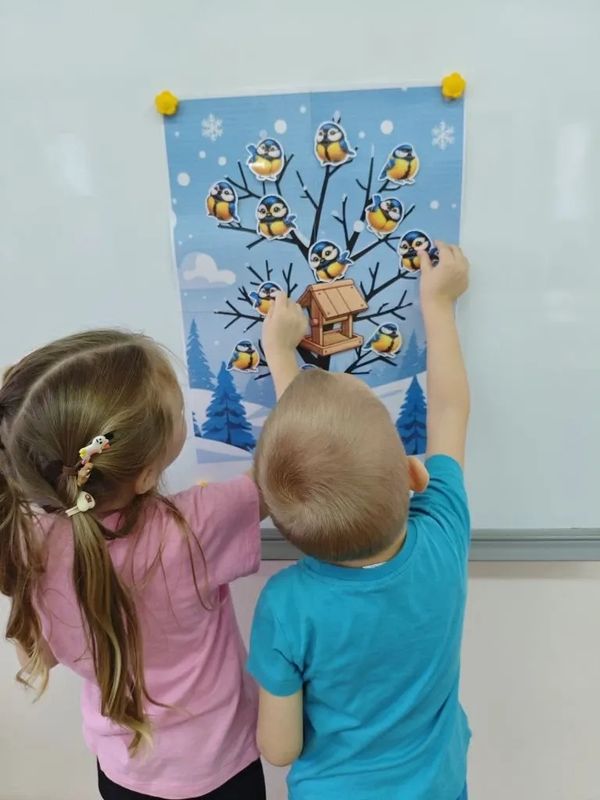 Воспитанники средней группы разгадывали загадки о зимующих птицах и украсили панно весёлыми птичками - синичками.
