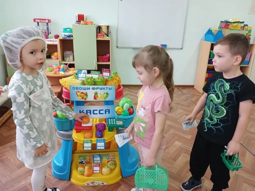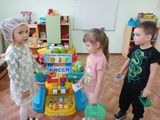 А также ребятам прежде чем начать готовить, необходимо посетить супермаркет 🛒и купить 🛍️только полезные продукты. И здесь у ребят ещё одна сюжетно- ролевая игра "Магазин".