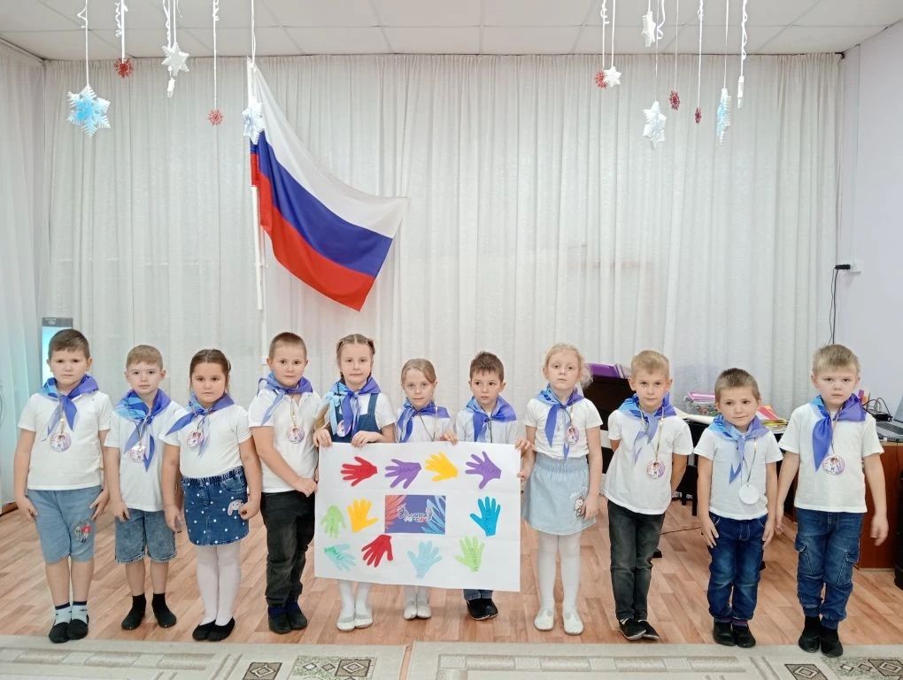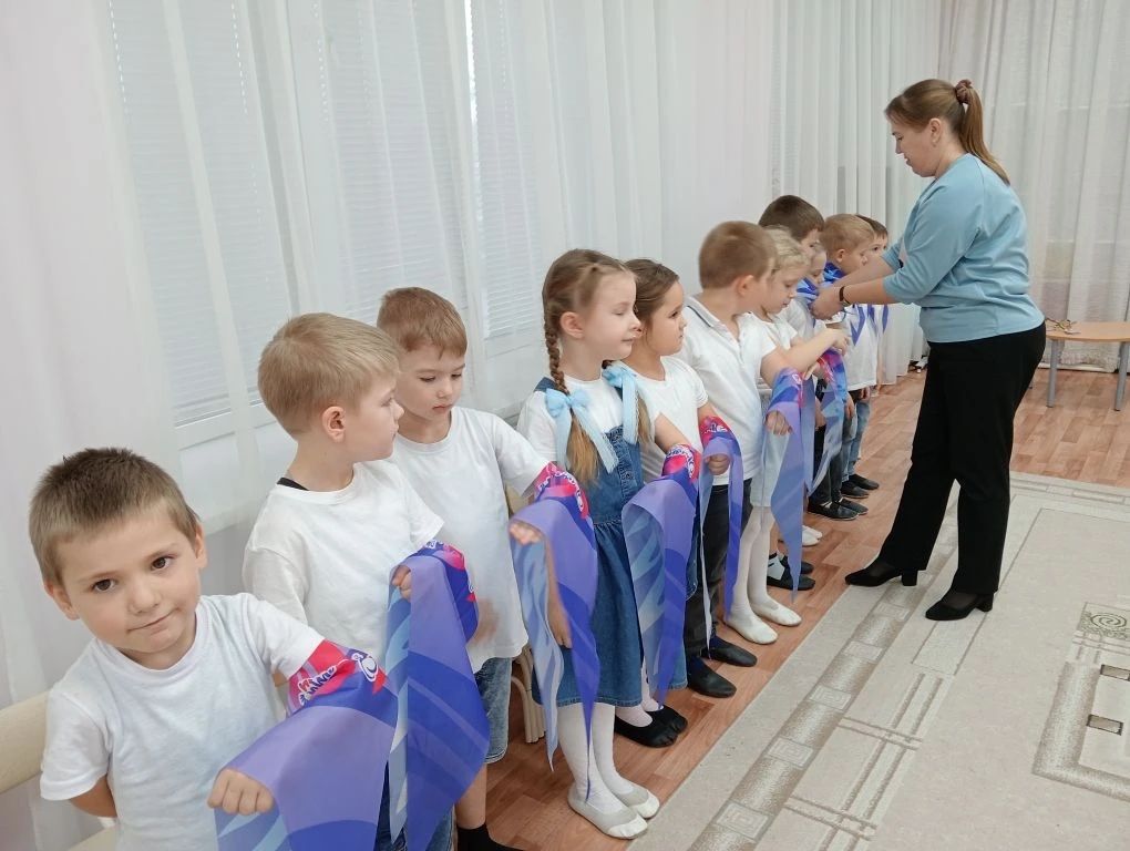 Наши воспитанники узнали сегодня легенду об орлятах, когда появилось данное движение и каким должен быть "Орленок-дошколенок". Затем прозвучала торжественная клятва ребята обещали: гордиться своей Родиной, совершать добрые дела и поступки, уважать старших и заботиться о младших, ценить дружбу, держать слово, поступать по чести и совести. Почетная миссия повязать мальчикам и девочкам галстуки "Орлята- дошколята" была предоставлена заведующему детским садом Паутовой Т.В. и руководителю детского сада Морозовой Л.Ю.